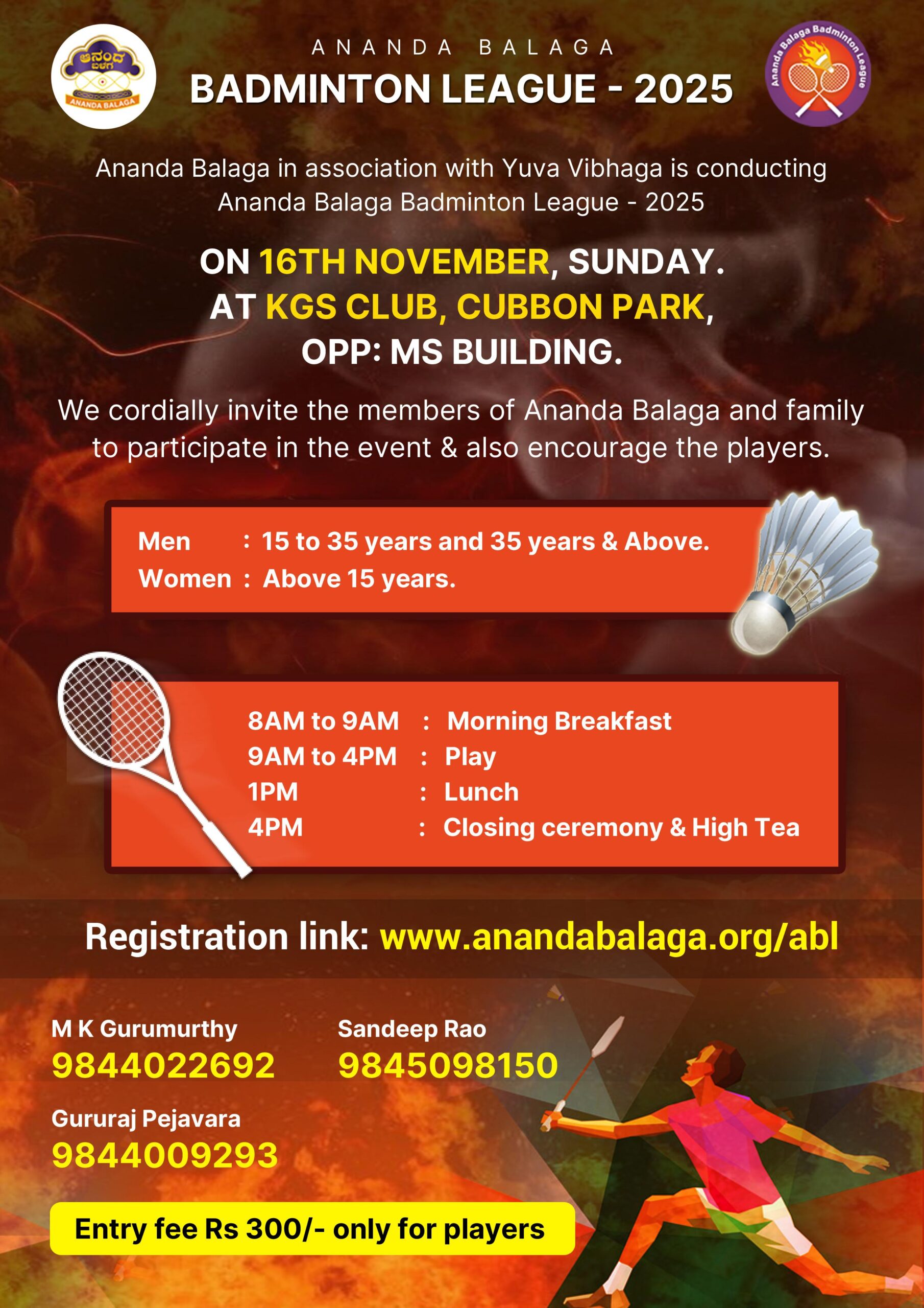 We are excited to inform you that ANANDA BALAGA has planned to organize the 4th BADMINTON TOURNAMENT. The tournament is titled as ANANDA BALAGA BADMINTON LEAGE (ABL) This tournament is organized for the members of the Ananda Balaga and is scheduled to take place on 16th November 2025, Sunday at KGS Club, Cubbon Park, Opp MS Building, Dr. Ambedkar road, Bangalore – 560001
